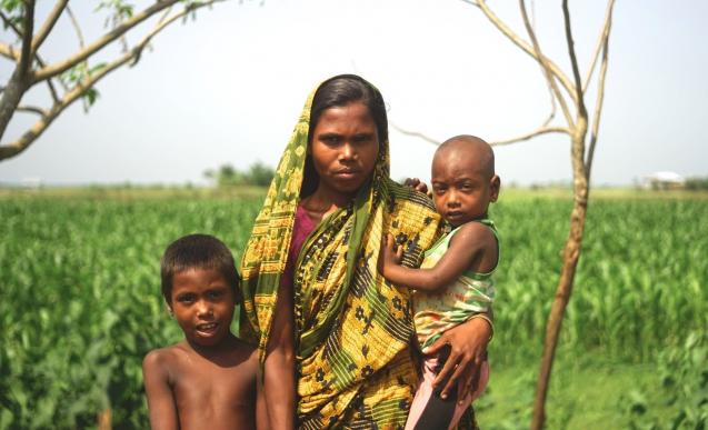 Dit is Shanti Begum uit Bangladesh met haar kinderen. Door klimaatverandering heeft zij te maken met overstromingen, extreme temperaturen en hevige regenval. Met hulp van ActionAid heeft Shanti toegang gekregen tot meer land om voedsel te verbouwen. Dankzij het toepassen van agro-ecologische technieken zijn haar gewassen beter bestand tegen klimaatverandering.