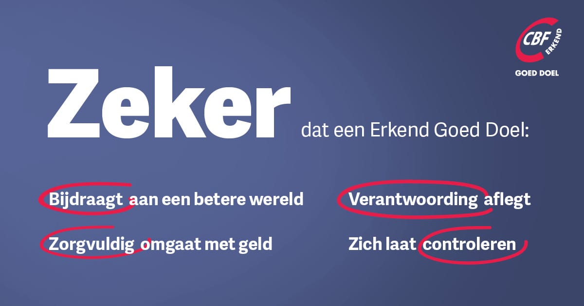 De Erkenning is het keurmerk voor goede doelen dat door het CBF, Toezichthouder Goede Doelen wordt uitgegeven. Met de Erkenning laten organisaties zien dat ze voldoen aan strenge kwaliteitseisen. Voor grotere organisaties gelden uiteraard andere eisen dan voor kleinere. Circa 80 procent van het particuliere geefgeld staat inmiddels onder toezicht van het CBF. Aan een Erkend Goed Doel kun je gerust geven omdat je ervan uit kunt gaan dat de organisatie daadwerkelijk bijdraagt aan een betere wereld, zorgvuldig omgaat met elke euro, verantwoording aflegt en zich onafhankelijk laat controleren.