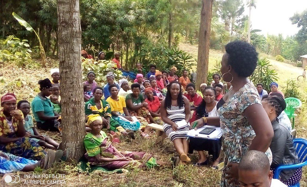 Een groepsgesprek in Oeganda over de impact van de klimaatprojecten in de omgeving.