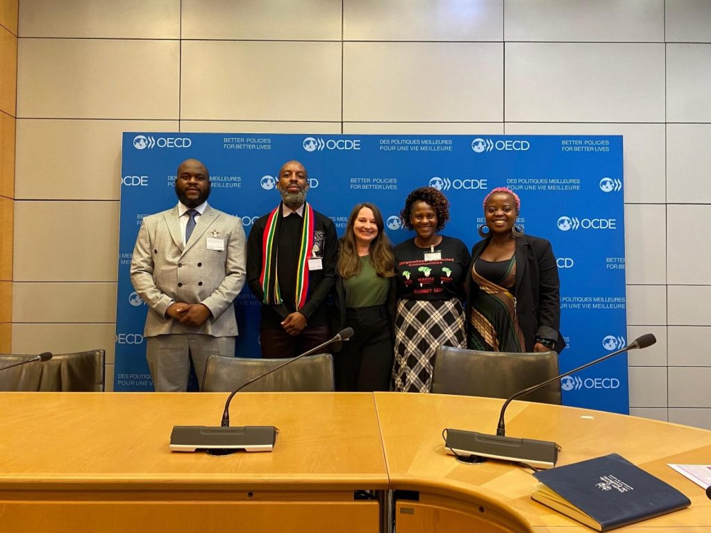 Van links naar rechts: Obert Bore van ZELA, Sifiso Dladla van ActionAid Zuid-Afrika, Mayely Müller van GIZ, Patricia Rabanye van WAMUA en Sophie Kwizera.