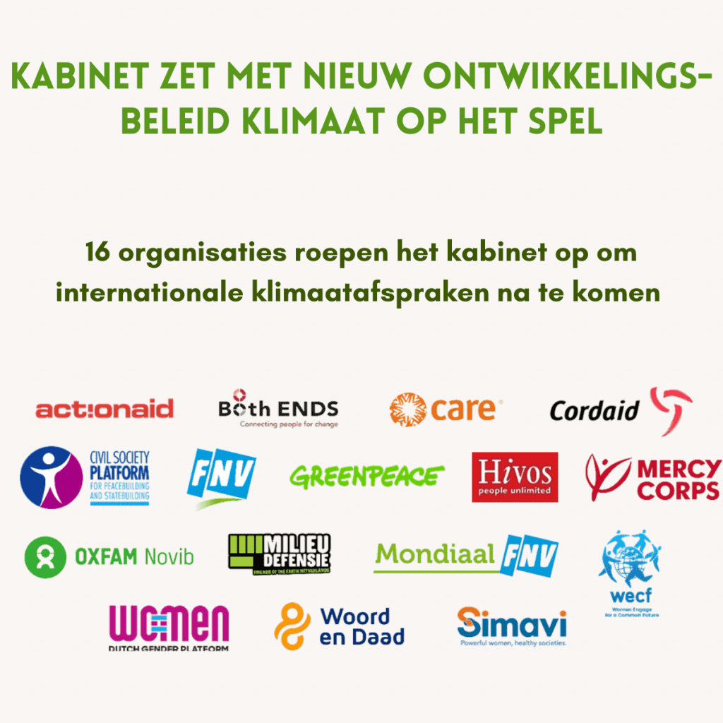 Minister Klever maakte onlangs de nieuwe koers bekend voor ontwikkelingssamenwerking. Het kabinet zet daarmee onder andere een streep door vrouwenrechten en maakt gezonde tegenspraak moeilijker. Maar het nieuwe beleid op ontwikkelingssamenwerking gaat ook in tegen de internationale klimaatafspraken, door fors te bezuinigen op klimaat. Dit raakt de mensen die het minst verantwoordelijk zijn voor de klimaatcrisis het hardst, met name vrouwen en meisjes in het mondiale Zuiden. Maar het schaadt ook de geloofwaardigheid van Nederland, en ondermijnt de toch al kwetsbare mondiale klimaatafspraken.