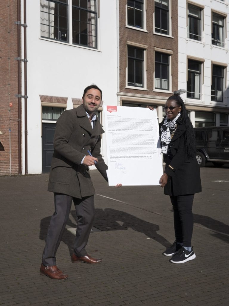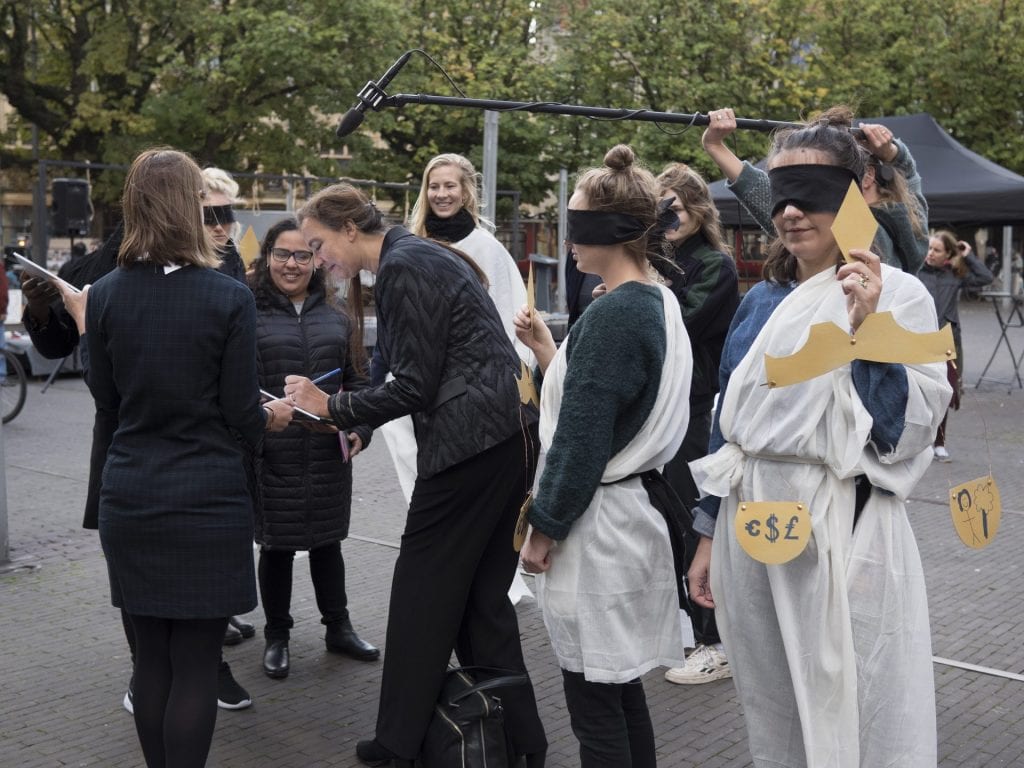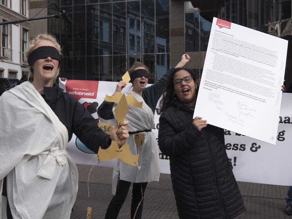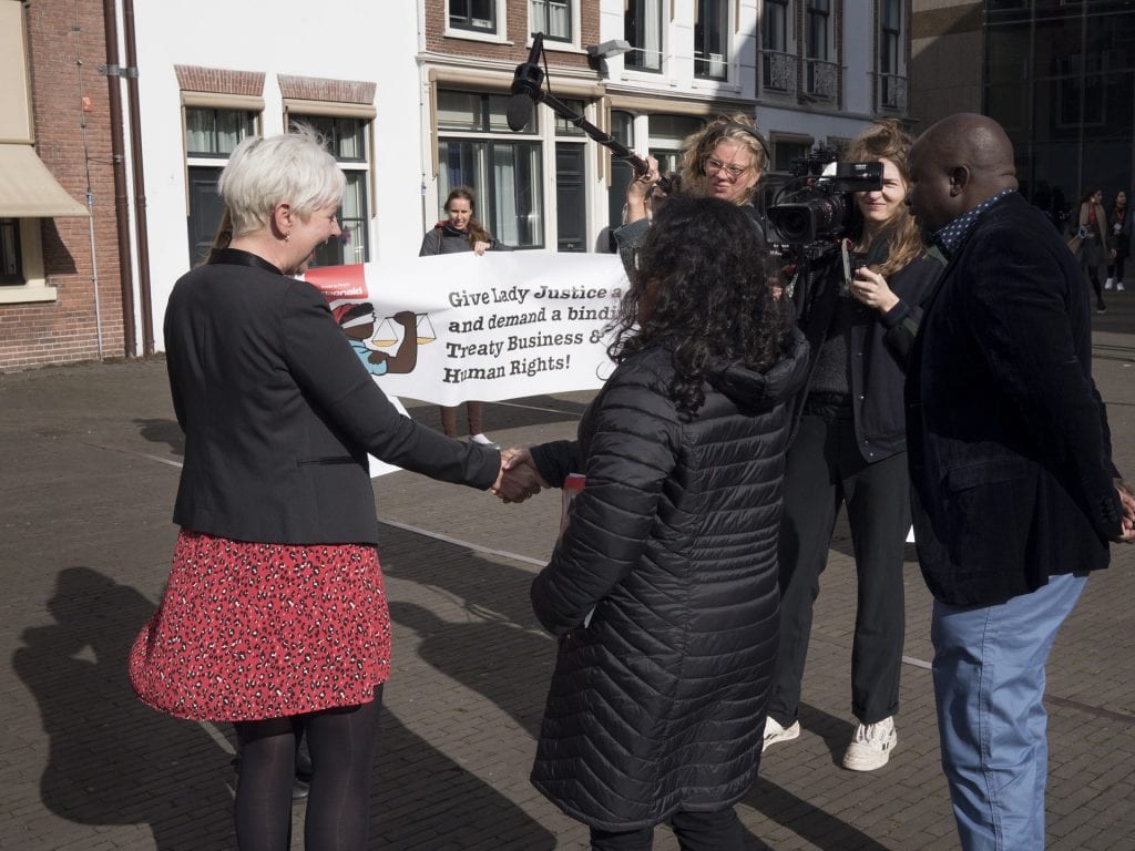In Den Haag organiseerden we een ludieke stunt om aandacht te vragen voor de brief die we aan Minister Kaag stuurden met de oproep aan Nederland om zich actief en ambitieus in te zetten tijdens de vijfde onderhandelingen voor een bindend verdrag bedrijfsleven en mensenrechten. Mahir Alkaya van de SP, Kirsten van den Hul van PvdA en Isabelle Diks van GroenLinks kwamen langs om hun steun te betuigen en de brief te ondertekenen. Er kwam luid en duidelijk van de groep de oproep: “Give Lady Justice a hand, demand a binding treaty business and human rights!”